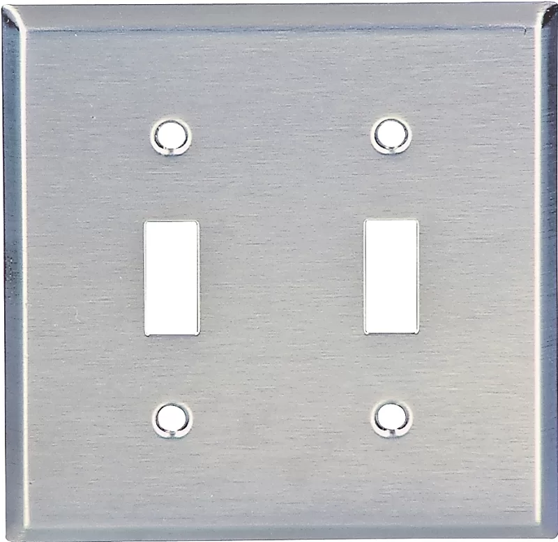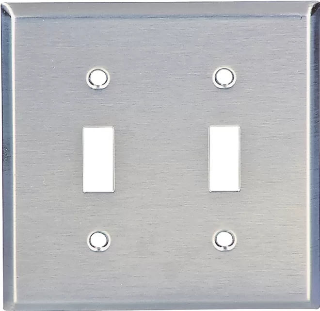 Number of Gangs: 2, Length: 4-1/2″, Width: 4.56″, Thickness: 1/32″, Mounting Type: Flush, Operating Temprature: -40 to 90 deg C, Material: Stainless Steel