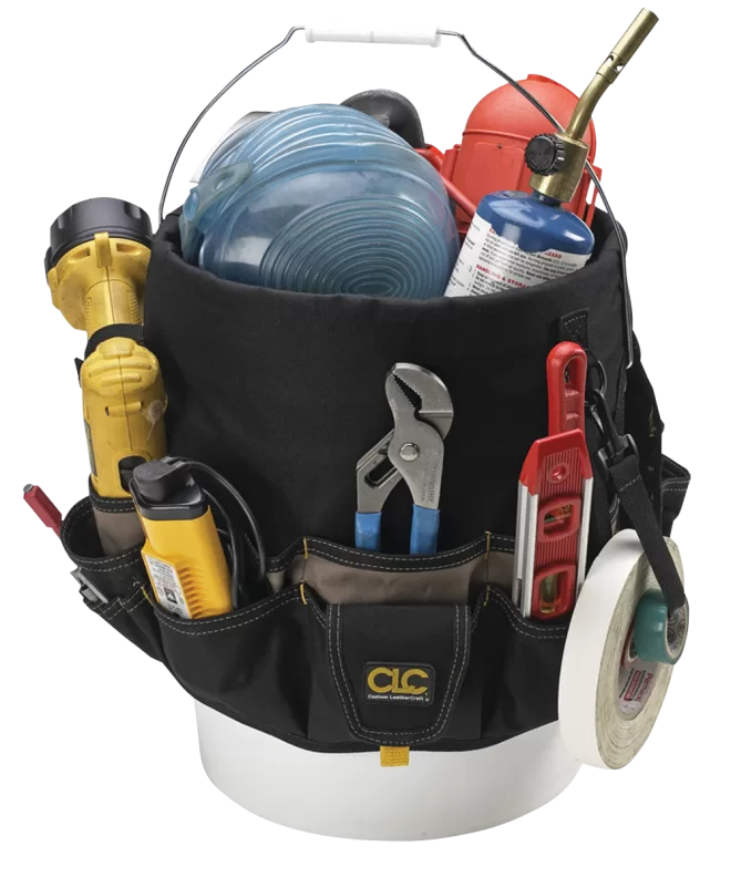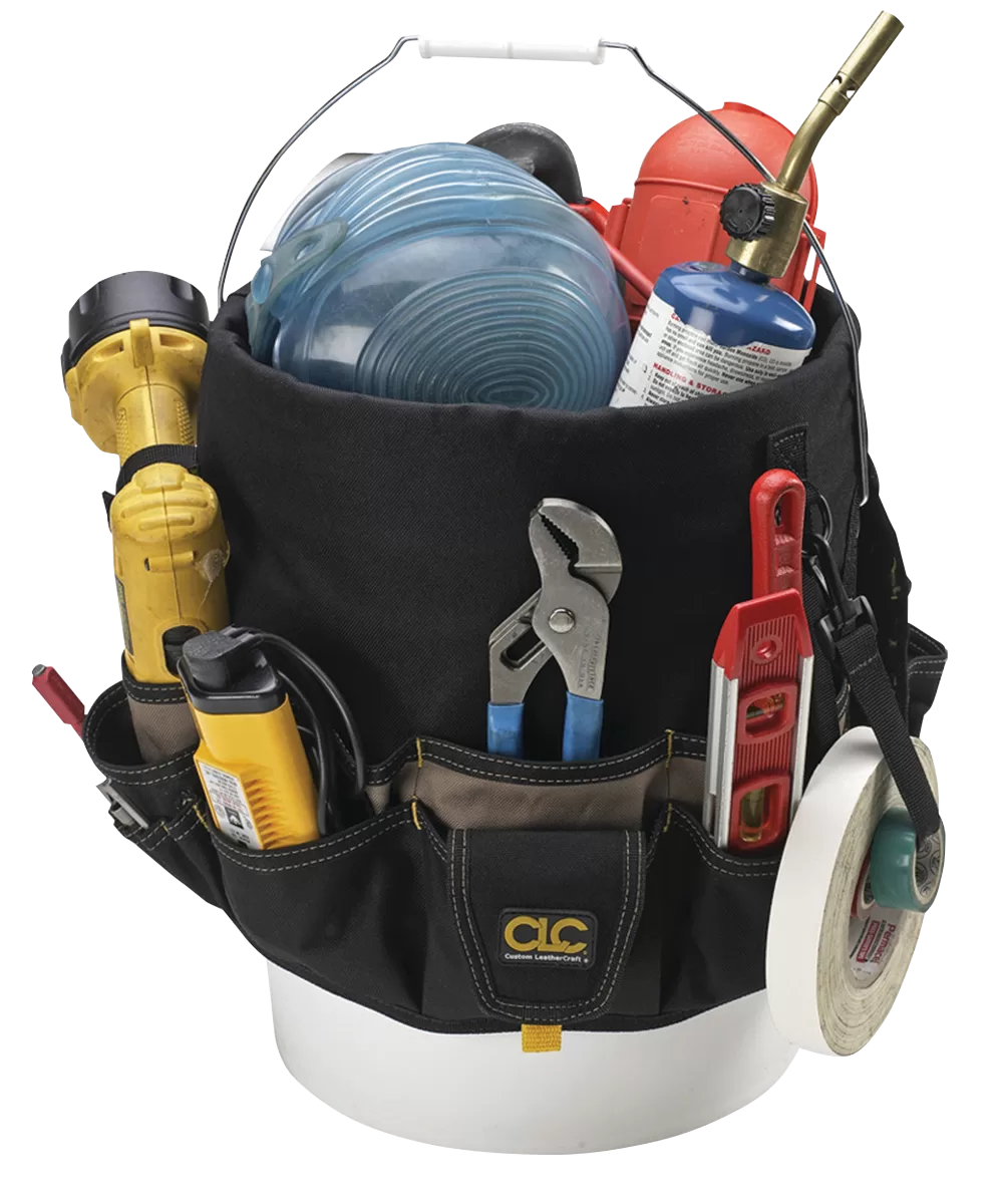 Our contractor-grade bucket organizer with 14 double-row pockets inside and 34 triple-row pockets outside, includes a tape loop, plus a cordless drill pocket with securing strap.