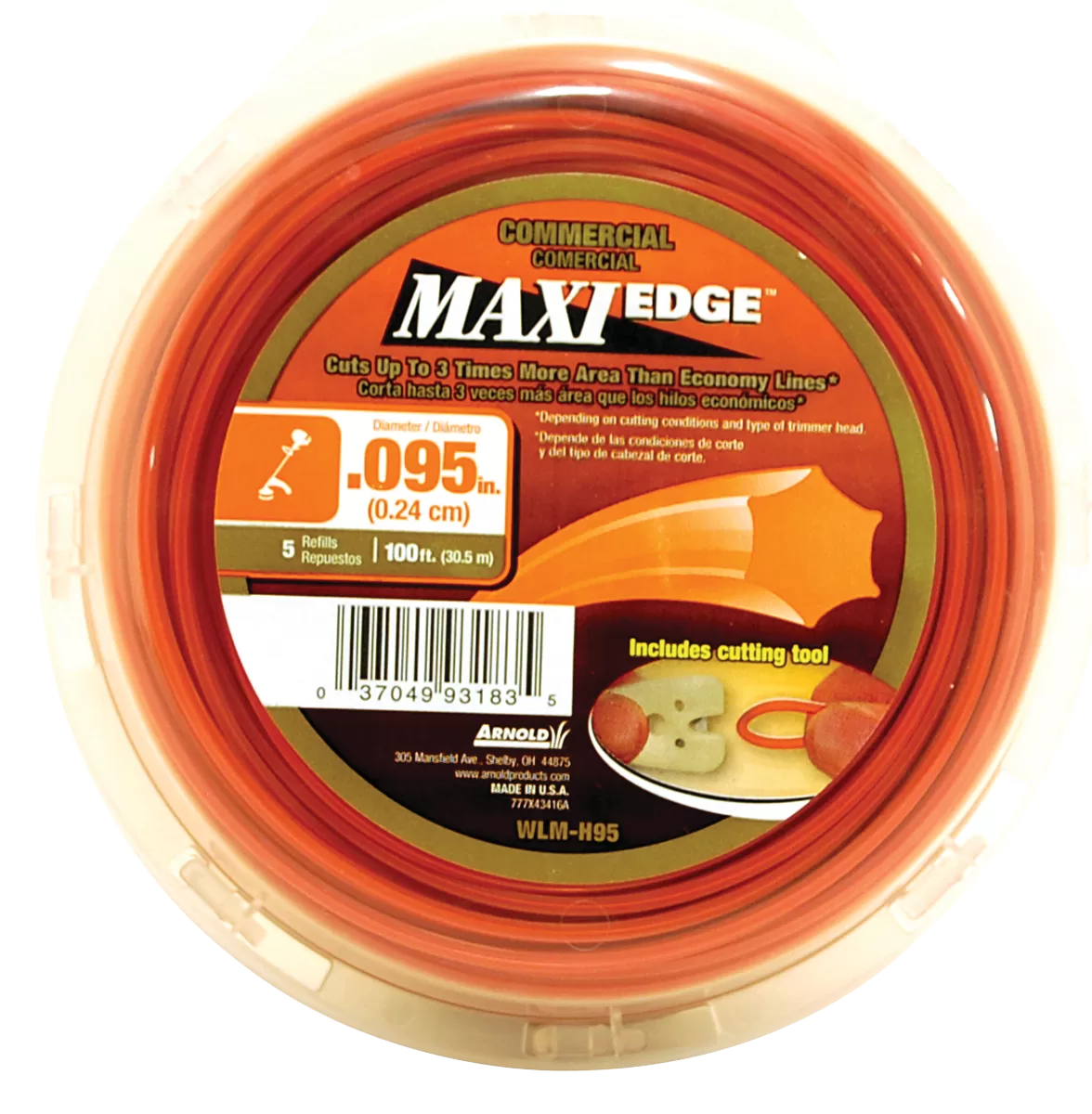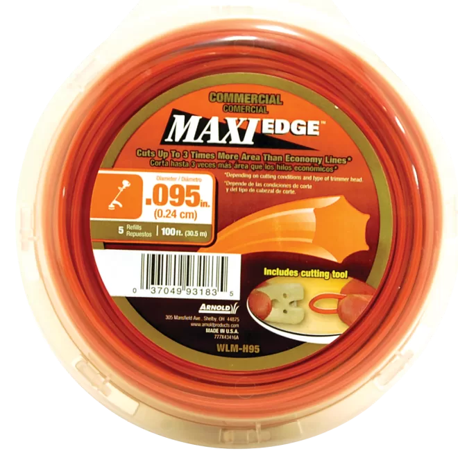 Arnold Maxi Edge Series WLM-H95 Trimmer Line, 0.095 in Dia, 100 ft L, Polymer, Orange. For bigger jobs and more frequent use. Cuts 3X more area than residential lines. Edged line shape improves cutting performance.