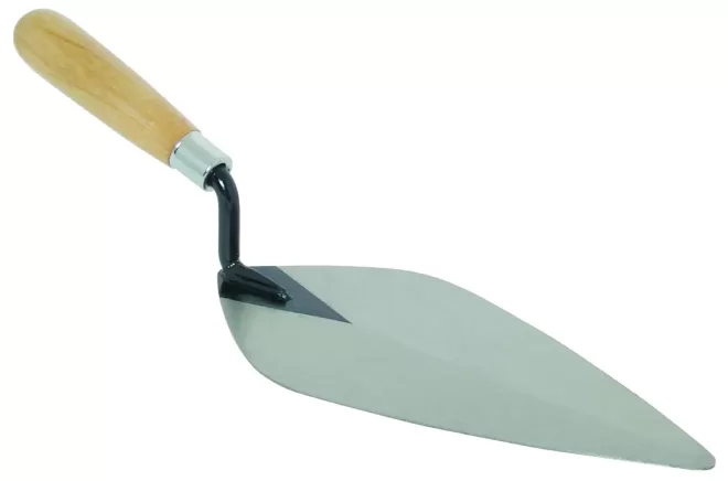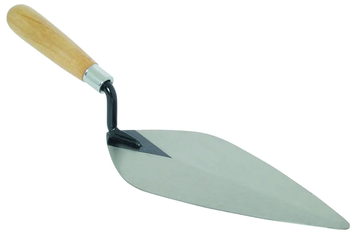 Blade tempered, ground and polished. Hardwood handle with steel ferrule securely attached. Used to pick up mortar and spread it in preparation for the next course of brick, concrete block or stone and to tap into place.