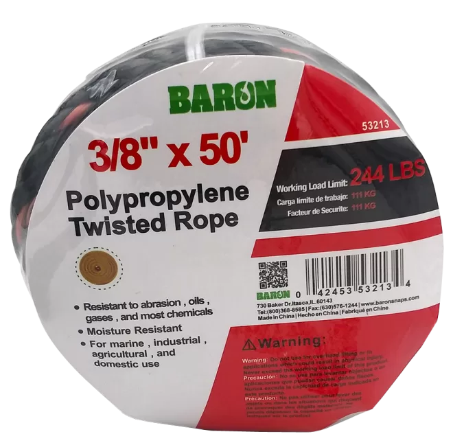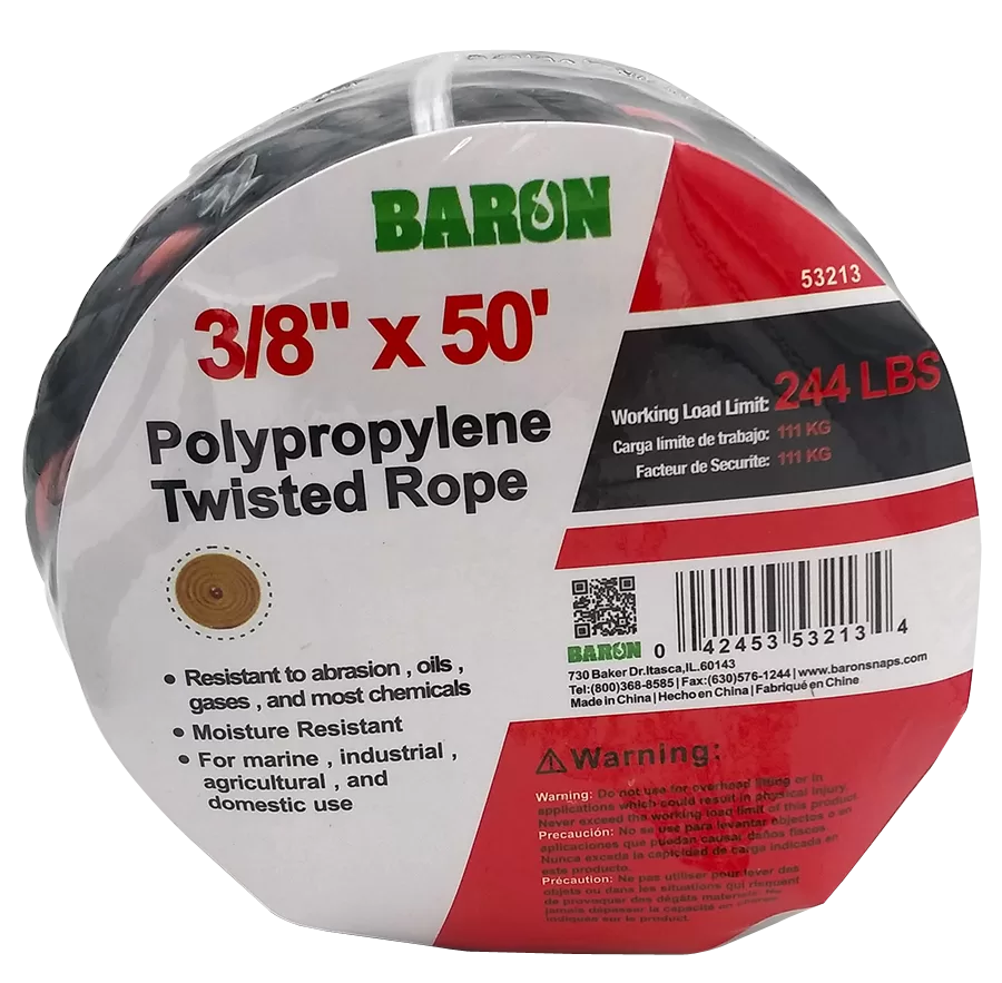 Baron Truck Rope, Working Load Limit: 244 lb, Rope Construction: Twisted, Polypropylene, Black/Orange, 3/8 in Dia, 50 ft L