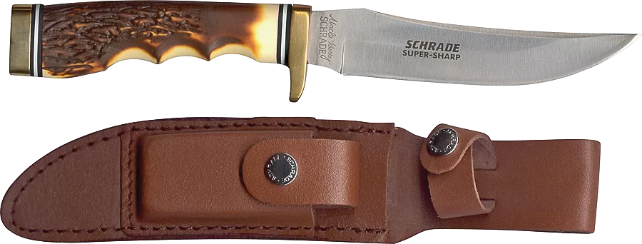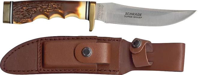 Staglon handle with stainless steel fixed blade. Includes leather sheath.