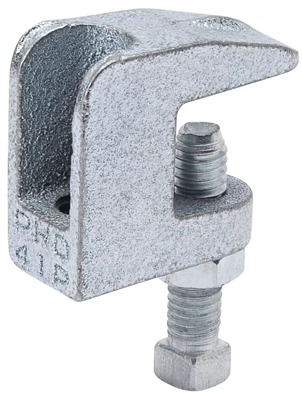 Galvanized malleable iron universal beam clamp used to attach hanger rod to top or bottom of a beam or joist.