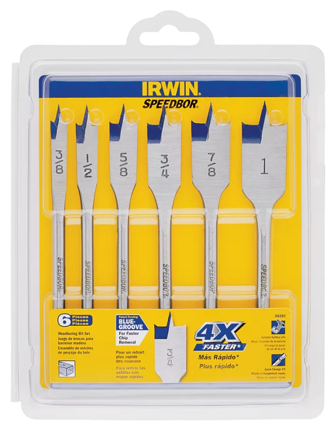 Grooved hex shank prevents slipping in drill chuck or bit extension, fits all standard quick change chucks. Includes one of each 3/8 in, 1/2 in, 5/8 in, 3/4 in, 7/8 in and 1 in. All are 6 in long standard length drill bits.