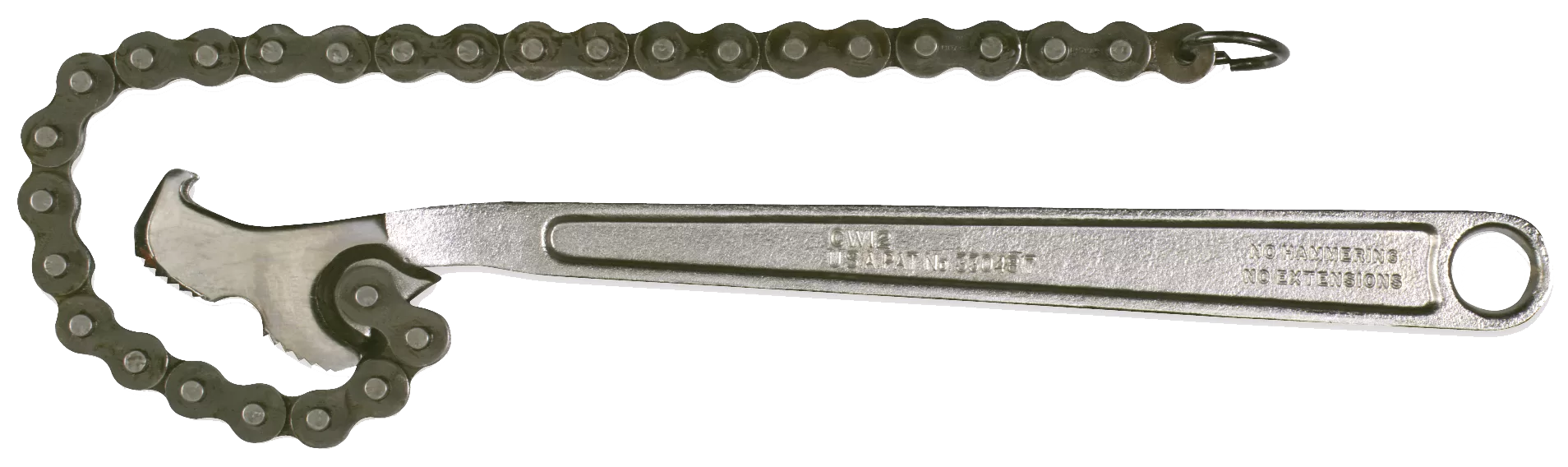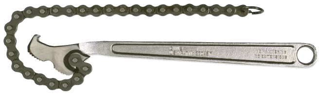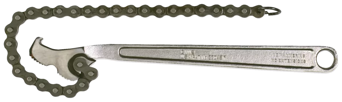 Nickel chrome-plated to resist rust. Double-action works in both directions. Handles have I-beam construction with a 15 in chain. Can be used in many instances where an ordinary pipe wrench will not fit.